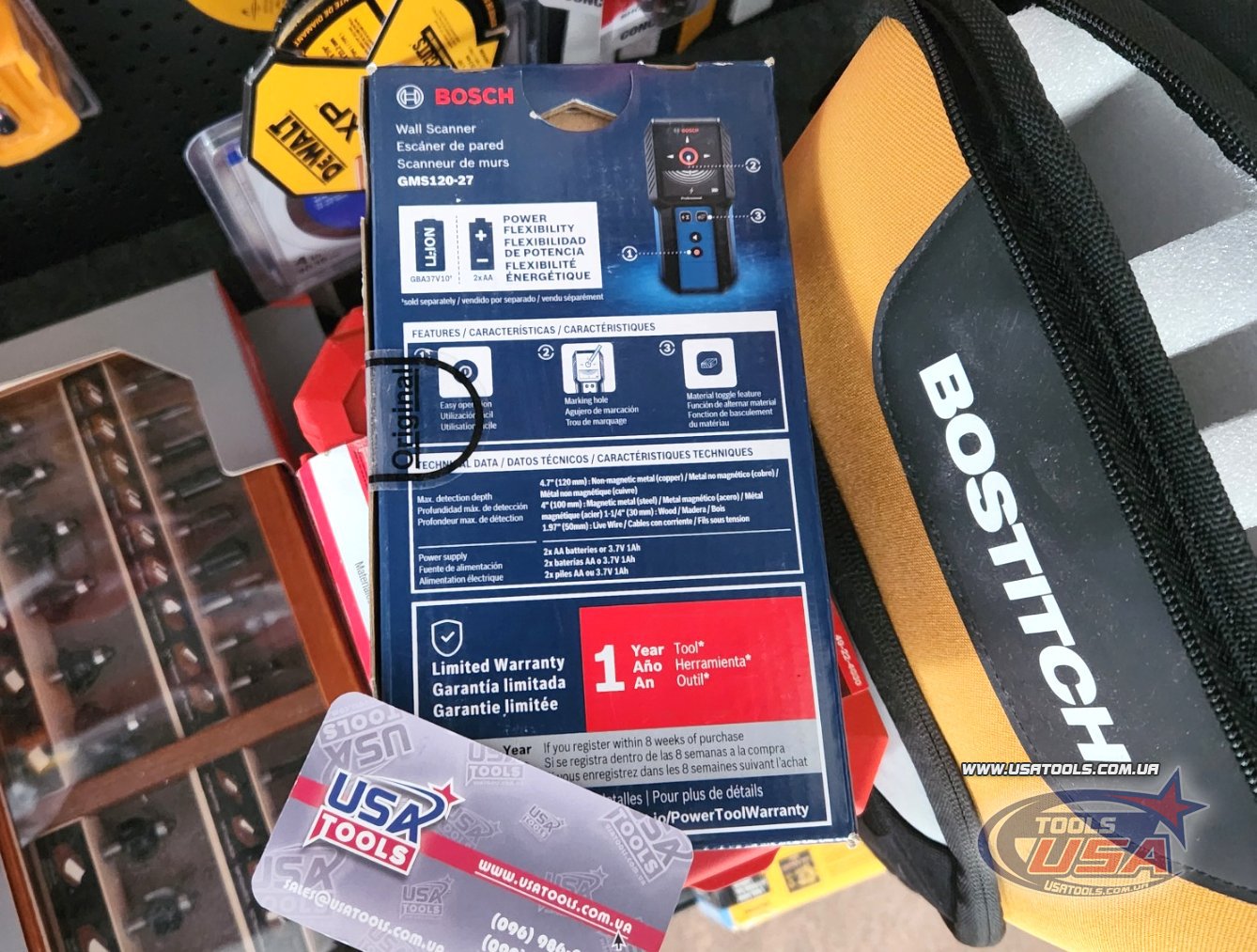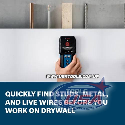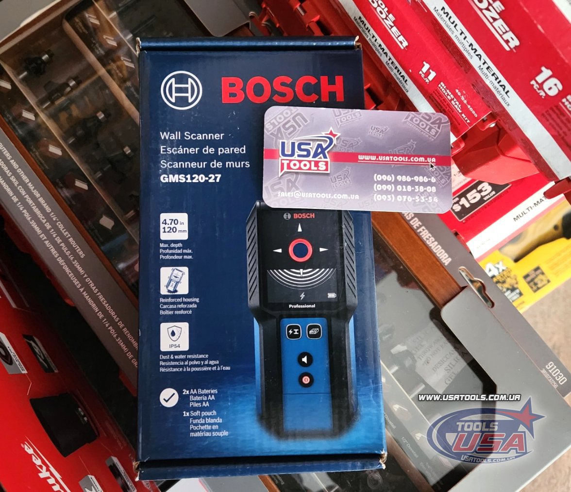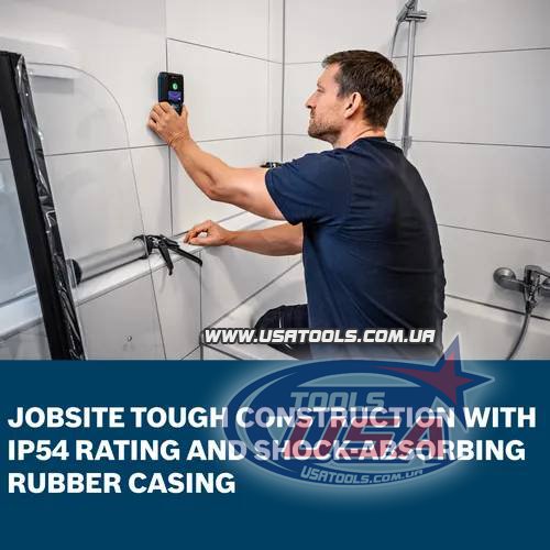 Сканер стін Bosch GMS120-27 забезпечує швидке, просте та точне виявлення дерев’яних і сталевих стійок, металів і проводки під напругою за гіпсокартоном. Гнучкість живлення дозволяє працювати як від двох батарей AA (входять у комплект), так і від акумулятора 3.7V Li-Ion (продається окремо). Інтуїтивний інтерфейс відображає центр об’єкта та тип матеріалу, що забезпечує чіткі результати. Пристрій легко ковзає по стіні, а підсвічене кольорове кільце допомагає швидко та точно переносити результати сканування. Захист IP54 і ударостійкий гумовий корпус забезпечують надійність на будівельному майданчику.